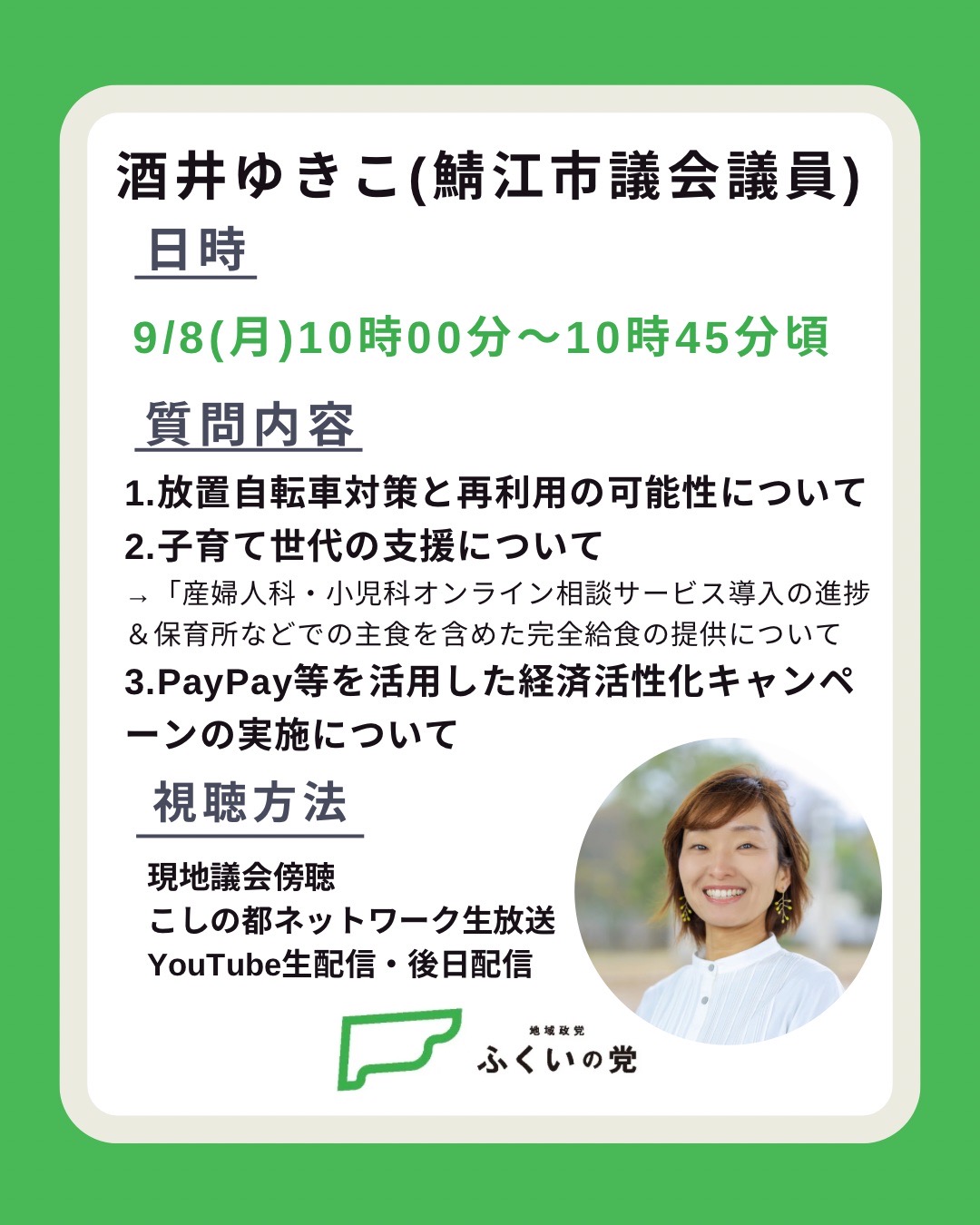 #ふくいの党 #地域政党 #酒井ゆきこ #鯖江市議会議員 #市議会 #議会 #一般質問