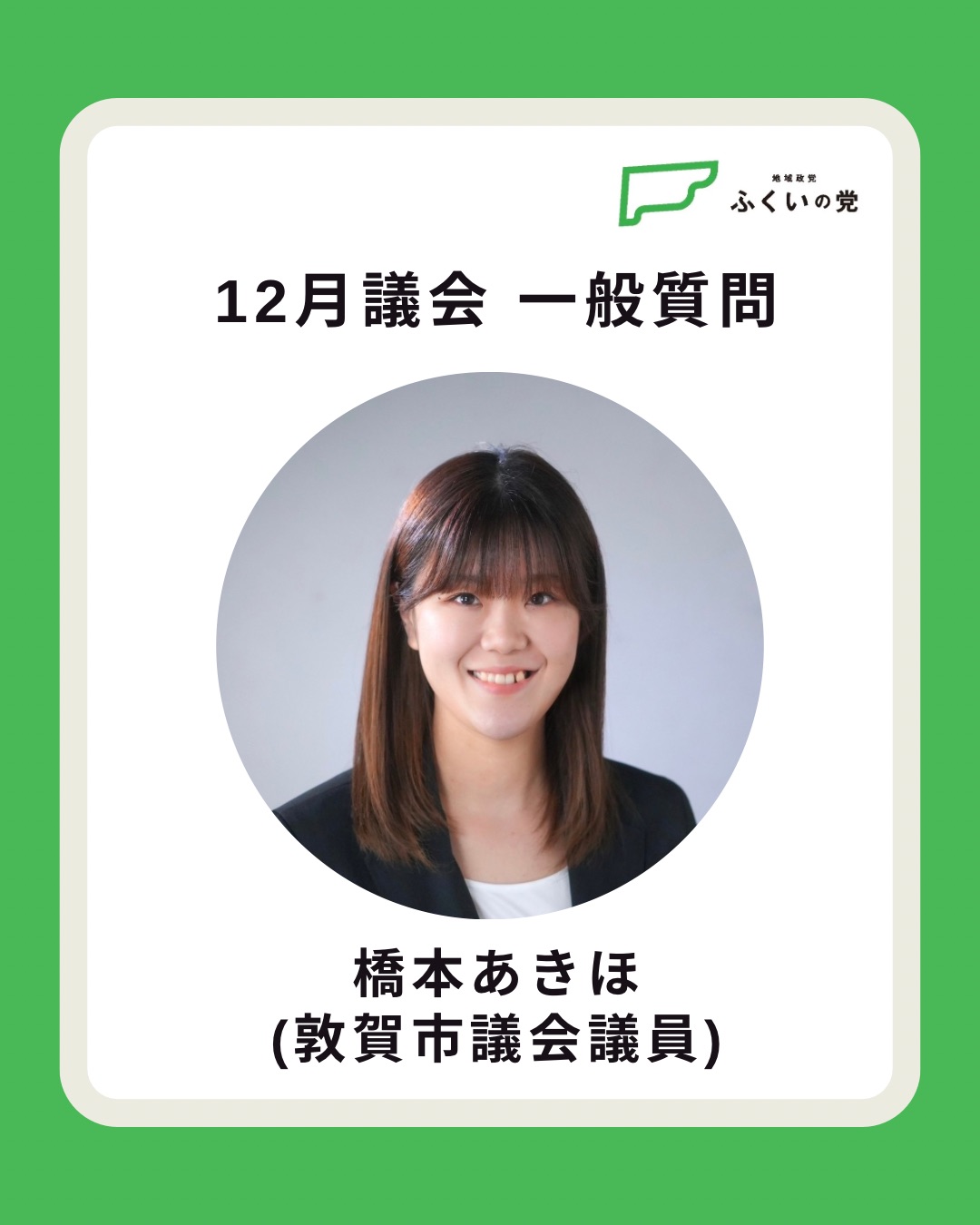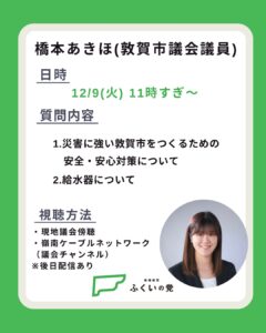 2025/12/05 お知らせ 最新情報 【12月議会 一般質問 橋本あきほ敦賀市議会議員】 5人目は、敦賀市議会の橋本あきほ議員です✨ 今回も大切なテーマを取り上げます! ぜひ頑張って欲しいですね😆 日時:12月9日(火) 11時過ぎ〜 一般質問内容: 1.災害に強い敦賀市をつくるための安全・安心対策について 2.給水器について 視聴方法: ・現地議会傍聴 ・嶺南ケーブルネットワーク(議会チャンネル)生放送と後日配信 ぜひ敦賀市役所の議場に足をお運びくださいませ😊👍 << 記事一覧へ