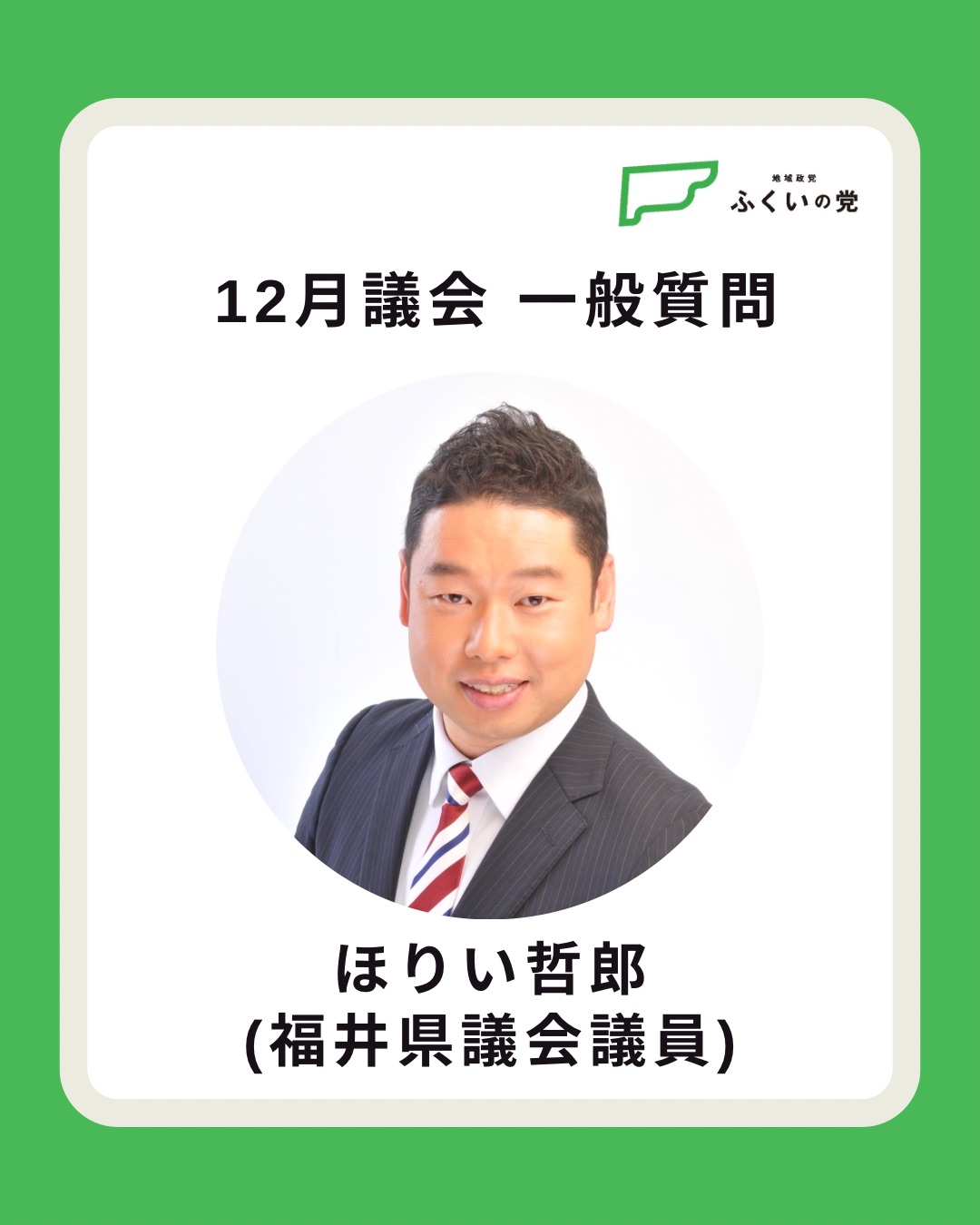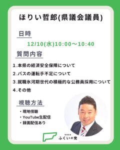 2025/12/05 お知らせ 最新情報 【12月議会 一般質問 堀居哲郎 県議会議員】 ふくいの党の中でも熱い男✨堀居県議も一般質問に立ちます😊 12月議会、最後のバッターです⚾️笑 日時:12月10日(水) 10:00〜10:40 一般質問内容: 1.本県の経済安全保障について 2.バスの運転手不足について 3.就職氷河期世代の積極的な公務員採用について 4.その他 視聴方法: ・現地議会傍聴 ・YouTube生配信(録画配信あり) 県民の想いを届けます☺️ ぜひ注目してご覧ください👍 << 記事一覧へ