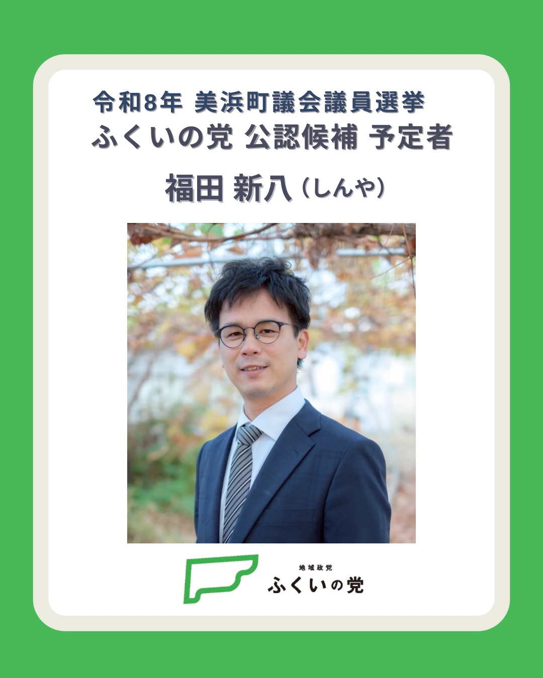 令和8年 美浜町議選で福田新八を党公認候補(予定者)に決定