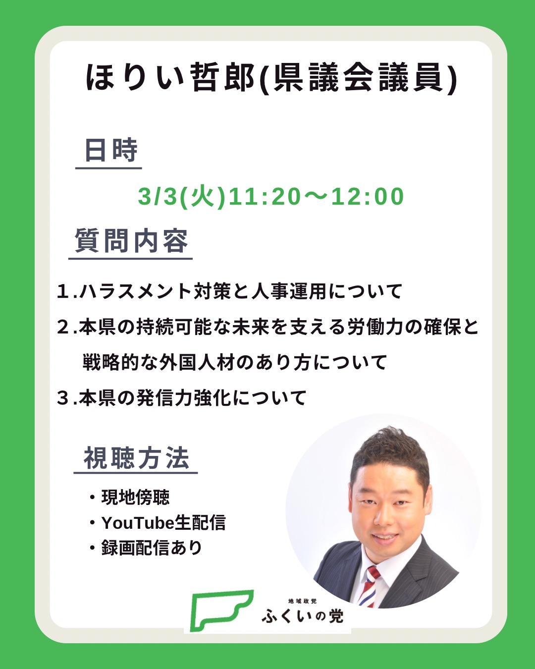 ほりい哲郎 県議会議員が一般質問に立ちます。