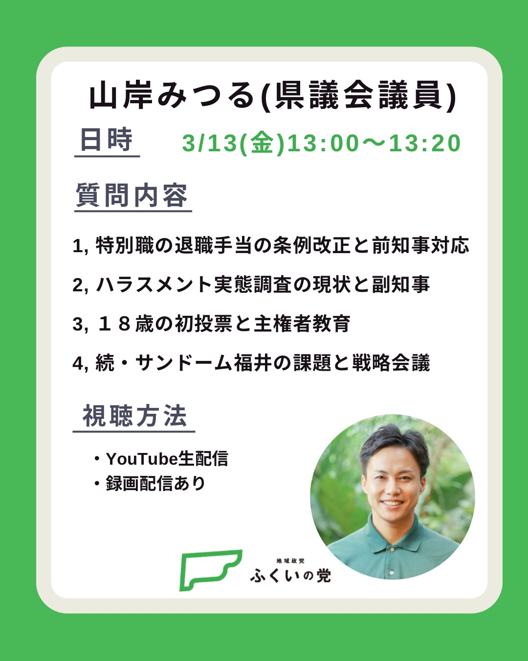 山岸みつる 福井県議会議員が質問に立ちます。